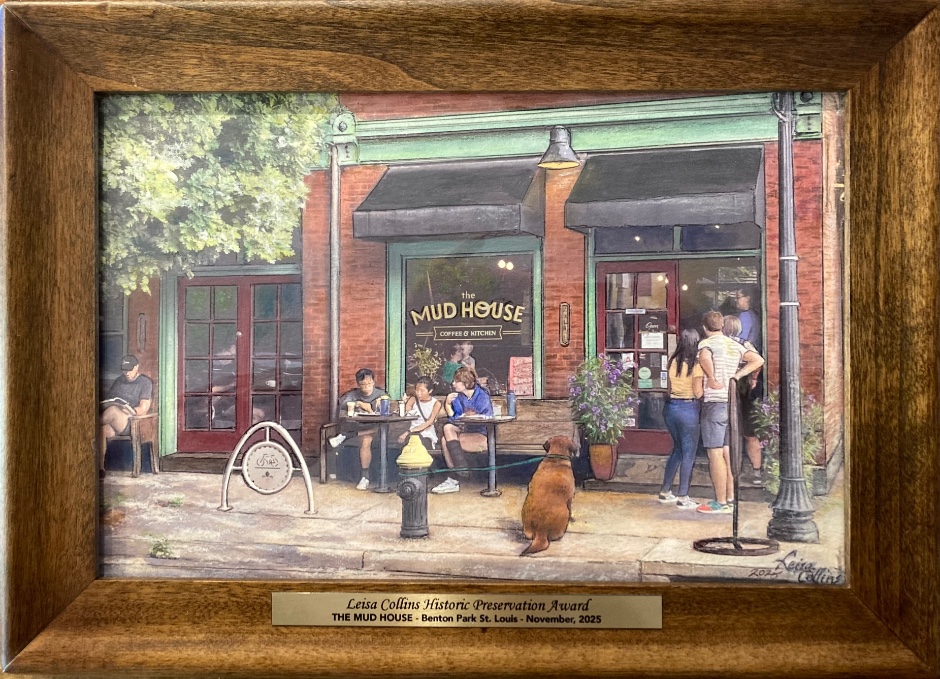 The Mud House Coffee Shop and Restaurant, is a small business in a fully renovated Benton Park 1880’s building which abounds in history and community spirit. I decided to depict these qualities in this painting and was proud to present this preservation award. As always, it is an original painting of the home or building that has been restored and otherwise brought back to life.